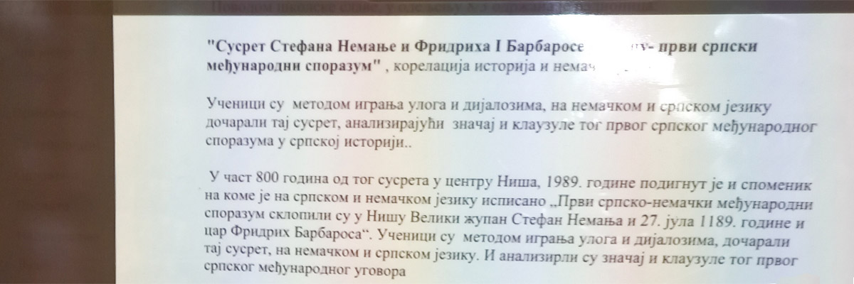 […] Савладах препреке византијских заповедника лета 1189. године од рођења нашег Исуса Христа. Немачки цар Фридрих Први Барбароса доможе се Ниша, а тамо га свечано дочекаше Стефан Немања и брат му Страцимир.